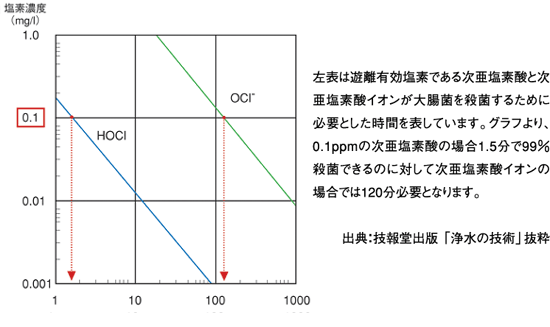 「次亜塩素酸(HOCl)」を80%以上含まれるように生成されるため、殺菌力が強力なのです。 <注1>塩素を水と反応させると塩素ガス(Cl2)と、次亜塩素酸(HOCl)と、次亜塩素酸イオン(OCl-)の3種類に変化します。このうち次亜塩素酸と次亜塩素酸イオンが殺菌作用を示し、これを「遊離有効塩素」と呼びます。特に次亜塩素酸の殺菌力は、次亜塩素酸イオンの約80倍もあります。アメリカ環境保護局[EPA]の検査で、大腸菌を死滅させるのに要した時間を、次亜塩素酸が1分とすれば、次亜塩素酸イオンでは80分かかっています。これは次亜塩素酸が次亜塩素酸イオンの80倍の殺菌効力を持つことを表しています。 |