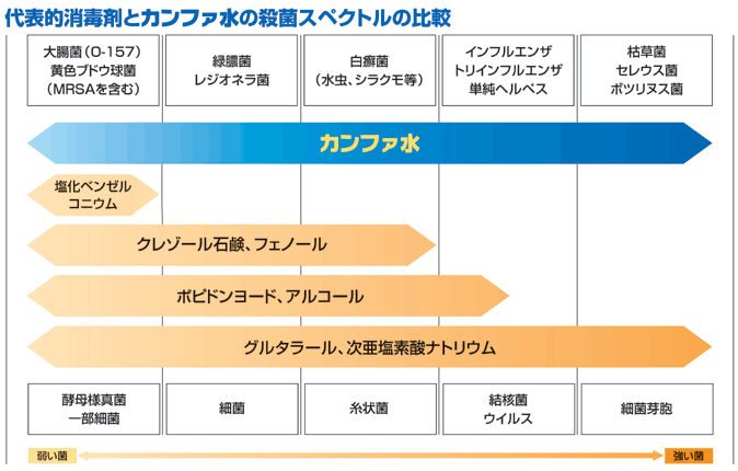 | 微生物や細菌等は弱い菌から強い菌まであり、カンファ水はほとんど全ての菌種に対抗する広い抗菌スペクトルをもちます。一般に医療関連施設などでは細菌の種類に応じ消毒剤を使い分けており、最も強い菌にはグルタラールアルデヒドなどを使用していますが、