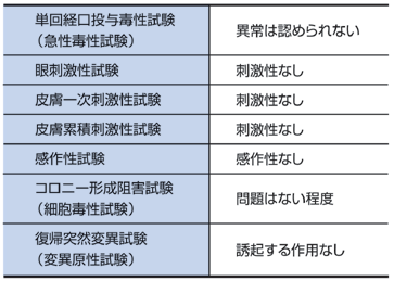 カンファ水が安全であることは、動物実験によっても立証されています。ウサギあるいはマウスを用いた試験によって、経口毒性、目の粘膜や皮膚に対する刺激性、遺伝的変異の誘発性が無いことが確認されています。 |