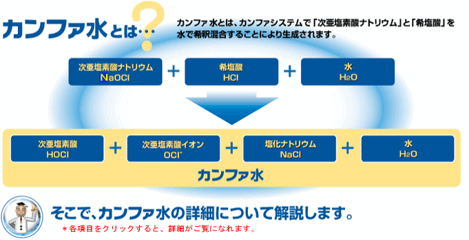 | カンファ水は手指洗浄などで使用する場合、中性に近い弱酸性、低濃度で使用できるために皮膚の炎症や手荒れなどを起こしません。また、体内に吸収したカンファ水の殺菌力の主成分である次亜塩素酸(HOCl)は人体内で細菌などの異物と反応した後効果が残留しないため人体に影響を与えず無害です。 |